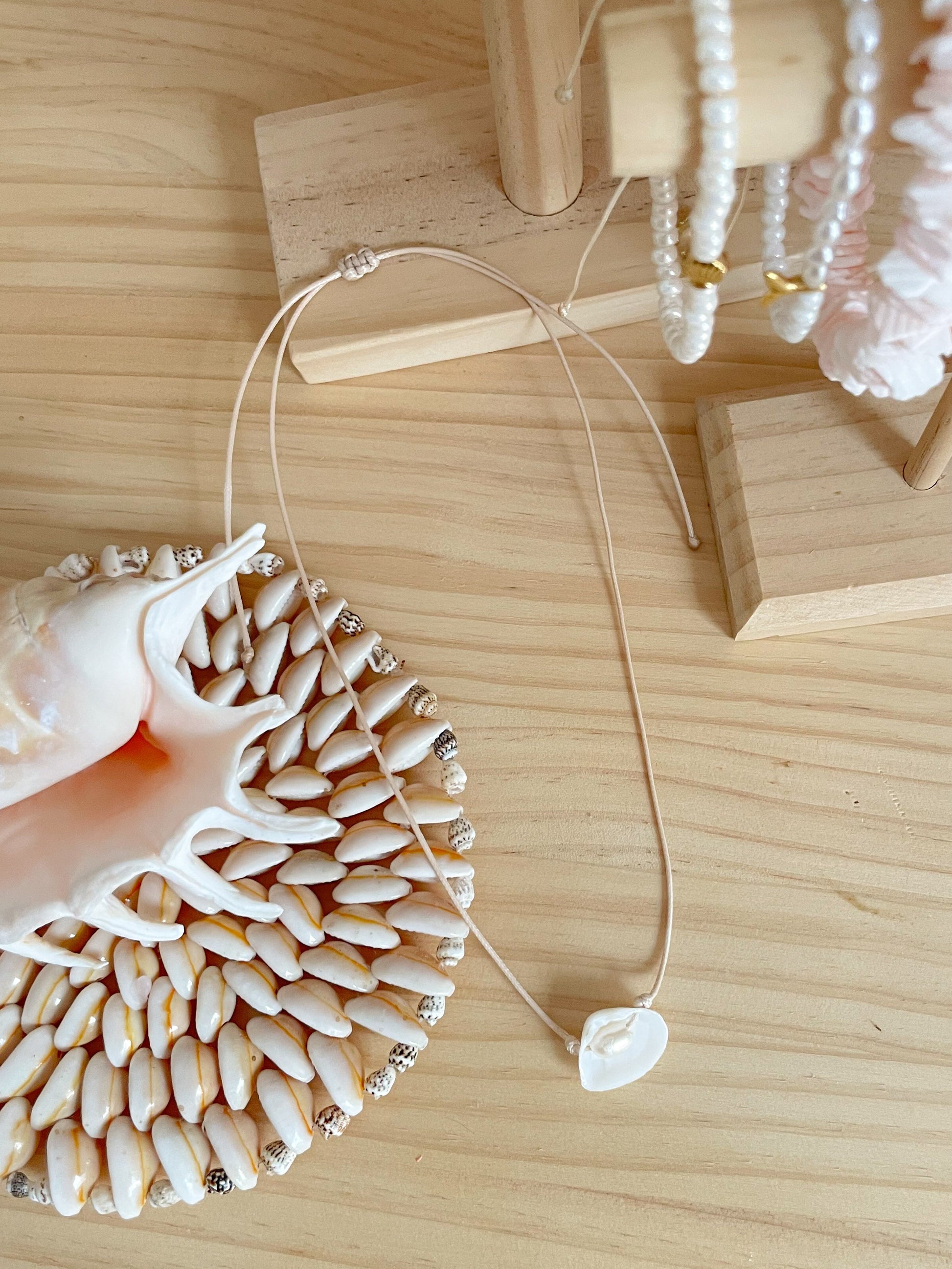 Zarte Kette mit einer echten Herzmuschel und einer schimmernden Süßwasserperle im Inneren. Jede Muschel und jede Perle ist ein Naturprodukt - Form und Glanz sind daher immer ein bisschen unterschiedlich.
