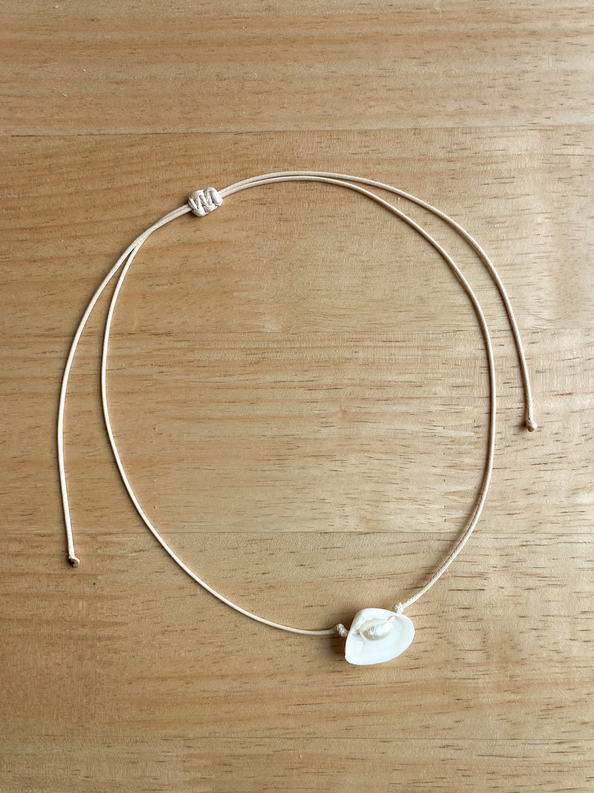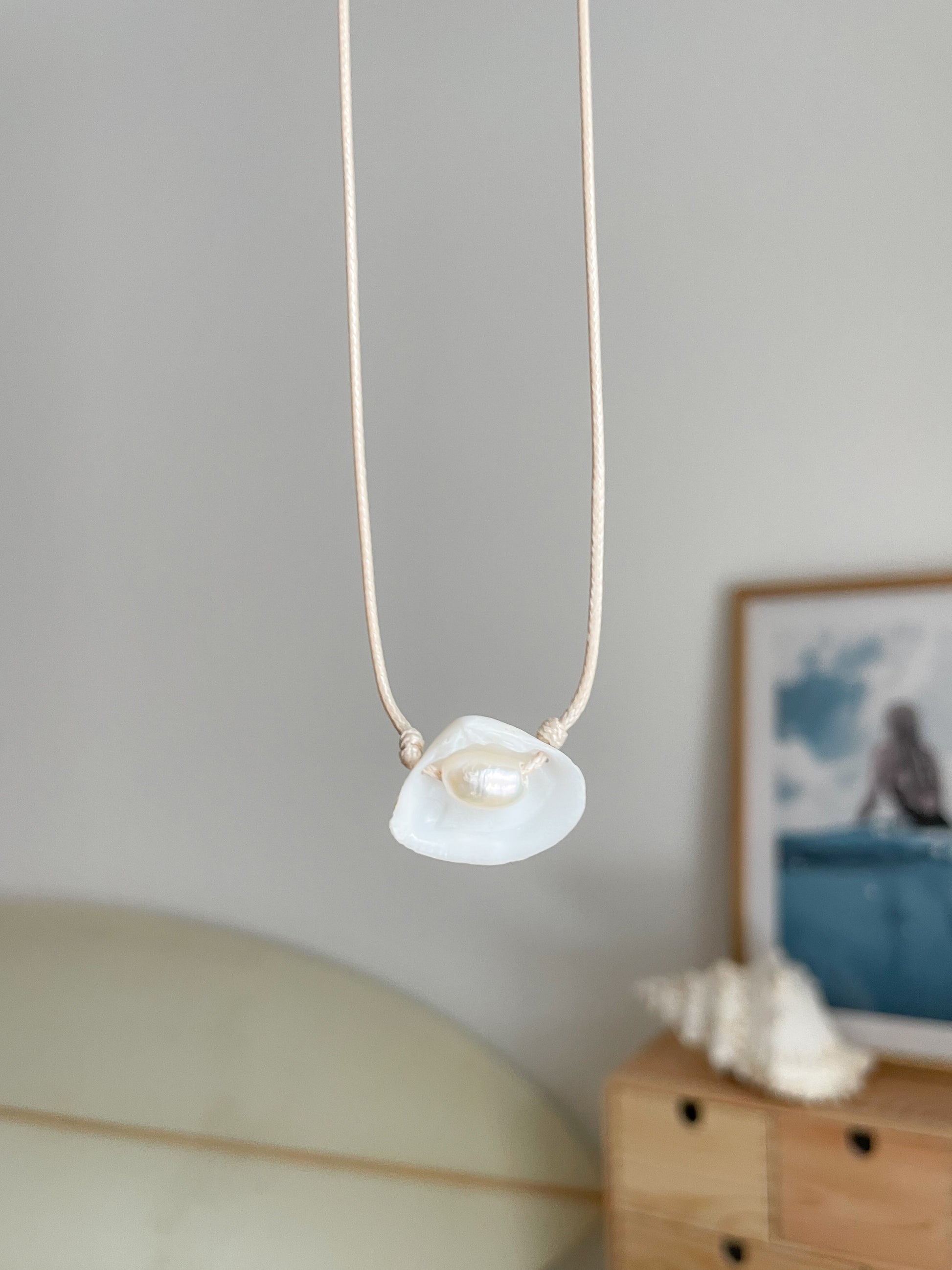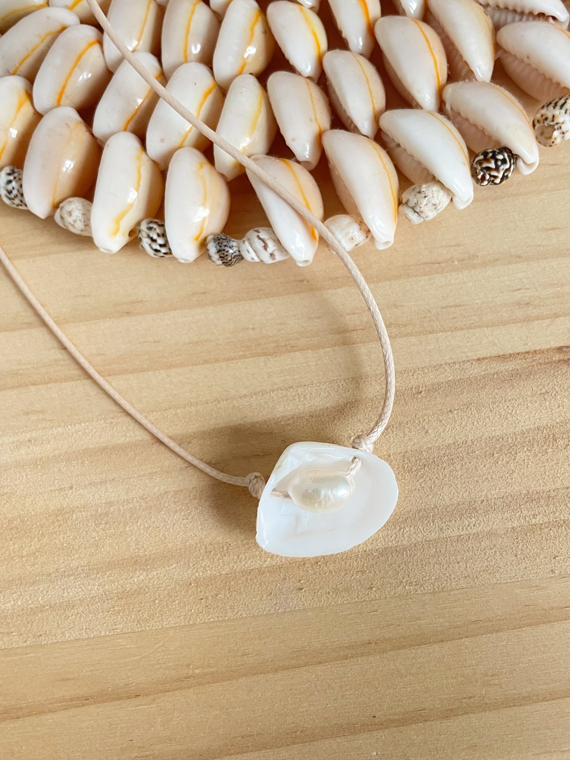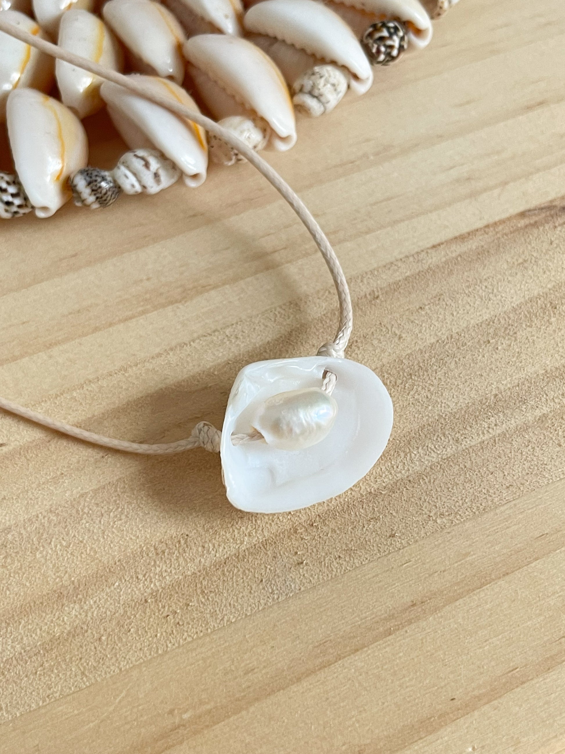Material: Gewachste Baumwoll-Kordel, Muschel, Süßwasserperle