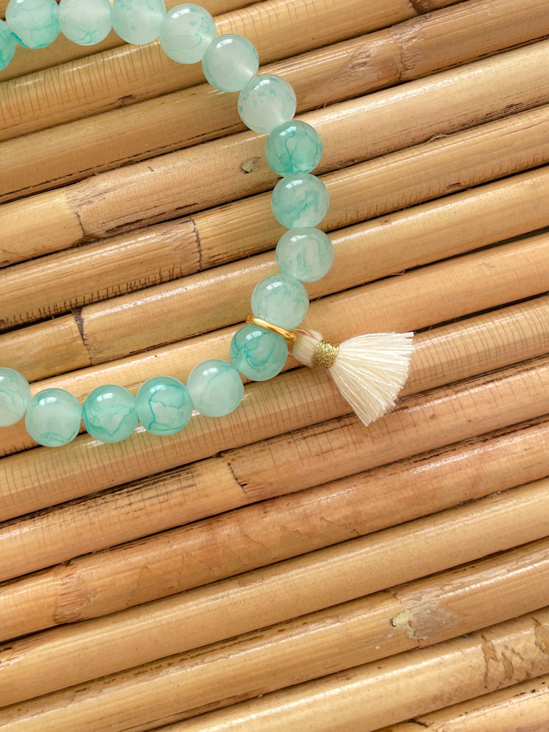Material: Glasperlen, Bindering aus Edelstahl, Quaste aus Baumwolle, elastisches Gummiband